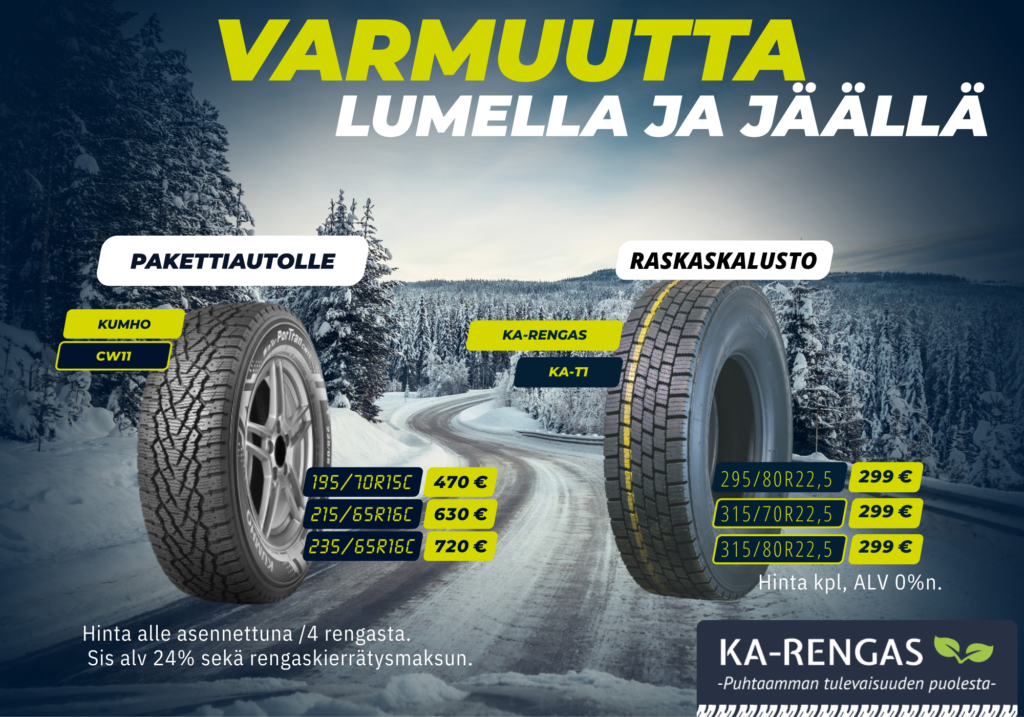 Ammattiautoilijoille tarjolla hyvä vaihtoehtoja pakettiautoista aina kuorma-autoihin asti. Esim Kumho CW11 paku rengas tai huimaa asiakas tyytyväisyyttä nauttiva oman mallistomme pinnoitettu vetorengas KA-T1, on tarkoitettu juuri nyt vallitseville keliolosuhteille raskaankaluston käyttöön. KA-T1 renkaita varastoissa kaikissa toimipisteissämme ja Pinnoittamon verkkokaupassa. Vetorenkaiden kaveriksi sopii Continentalin talvi eturenkaat, suoraan varastostamme – tietysti!