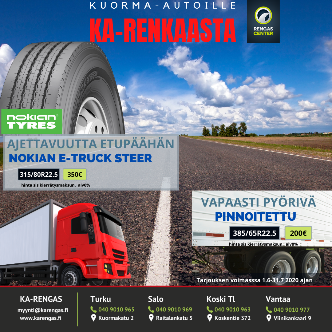 Kuorma-autoille nyt tarjolla Nokian eturengasta sekä perävaunuun todella edullisesti leveämpää pinnoitettua rengasta!